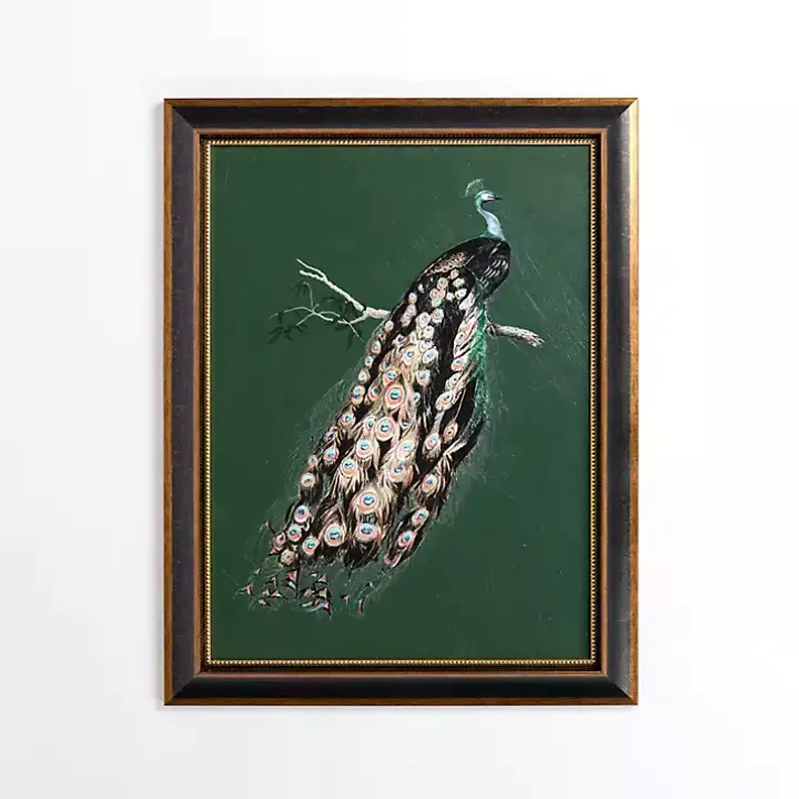 The gorgeous bird depicted in this Green Peacock Framed Art Print will add sophistication to your walls. Its deep colors and golden frame accents easily elevate any space!