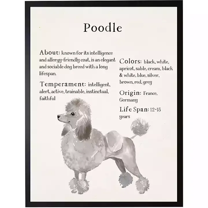 Treat the Poodle owner in your life with our Poodle Facts Framed Wall Plaque. They will be ecstatic to incorporate their favorite pooch into their decor!