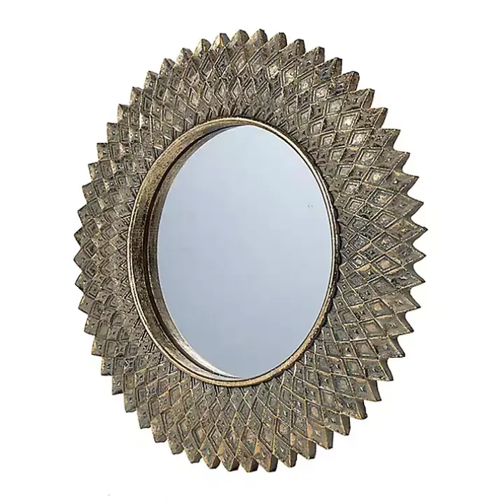 With a lavish design and radiant finish, this Round Gold Textured Diamond Wall Mirror makes a brilliant addition to any room. Its antique look will instantly elevate your decor!