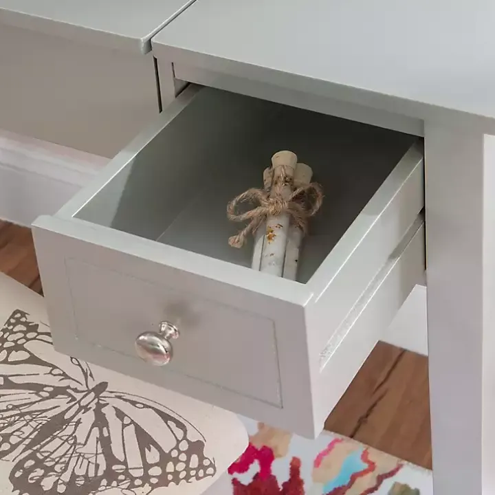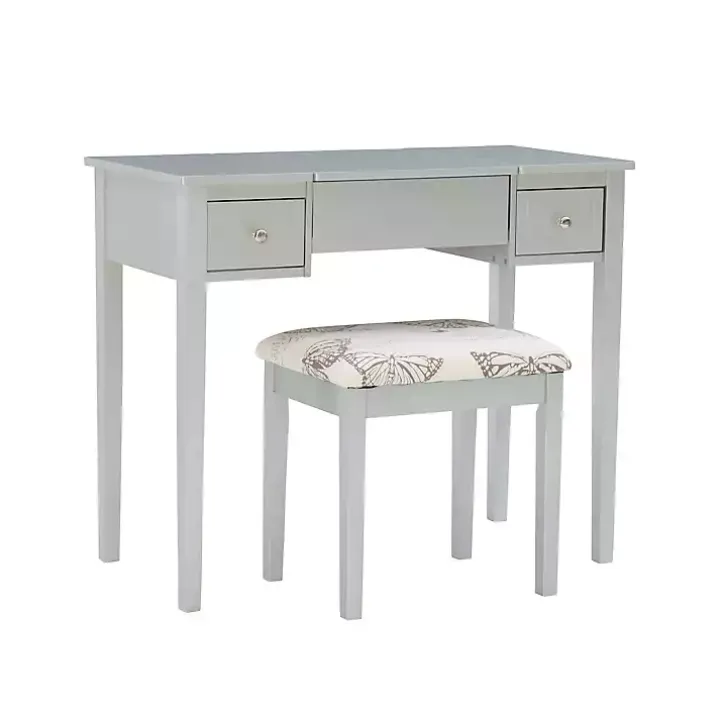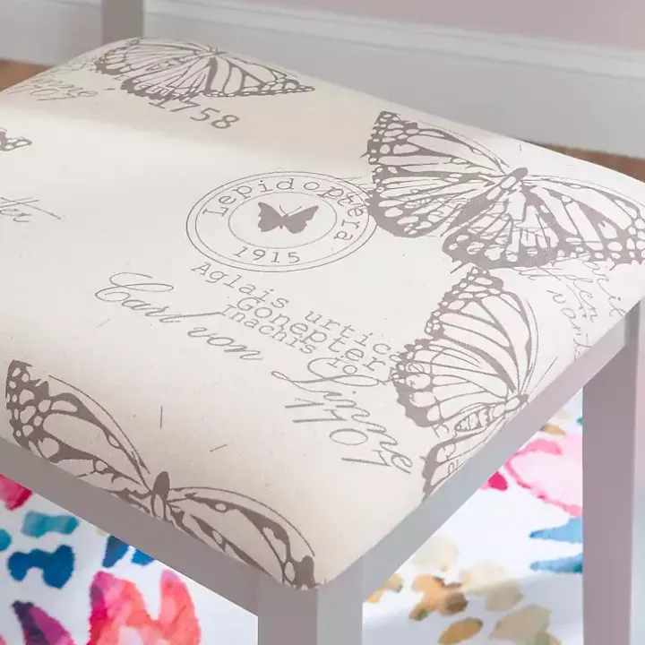 Constructed of solid wood, this Silver Virginia Butterfly Vanity Set includes a matching stool upholstered with a unique butterfly print on linen fabric. With two drawers and a lift top mirror, you’ll find ample storage for beauty supplies!