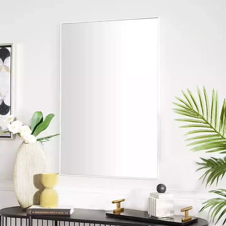 Embrace artistic expression with a style that highlights bold designs with sleek lines, neutral elements, and a minimalist aesthetic! Truly a posh and pragmatic addition to your home space, this White Wood Rectangular Wall Mirror will easily complement neutral-toned walls.