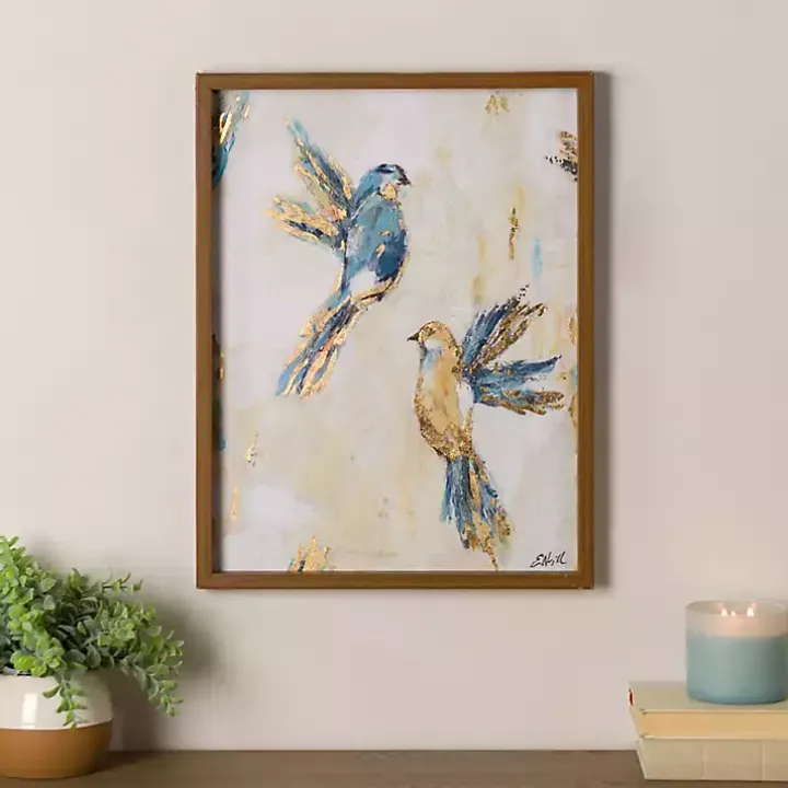The dynamic duo featured in our Blue and Gold Birds Framed Art Print will bring a stunning beauty to your space. Its golden accents are sure to make any wall shine!