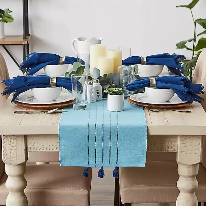 Set your table with elegance and style. The Blue Thera Stripe Table Runner is the perfect way to add a unique look to your table and impress your guests.