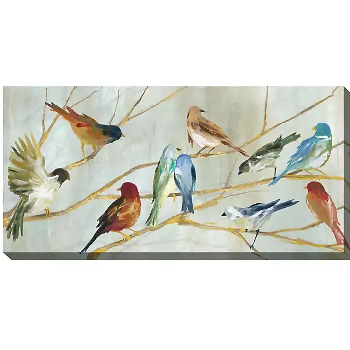 Gift our Branching Out Outdoor Canvas Art Print to your favorite bird watcher. This canvas beautifully contrasts with its gray background and collection of vividly colored birds.