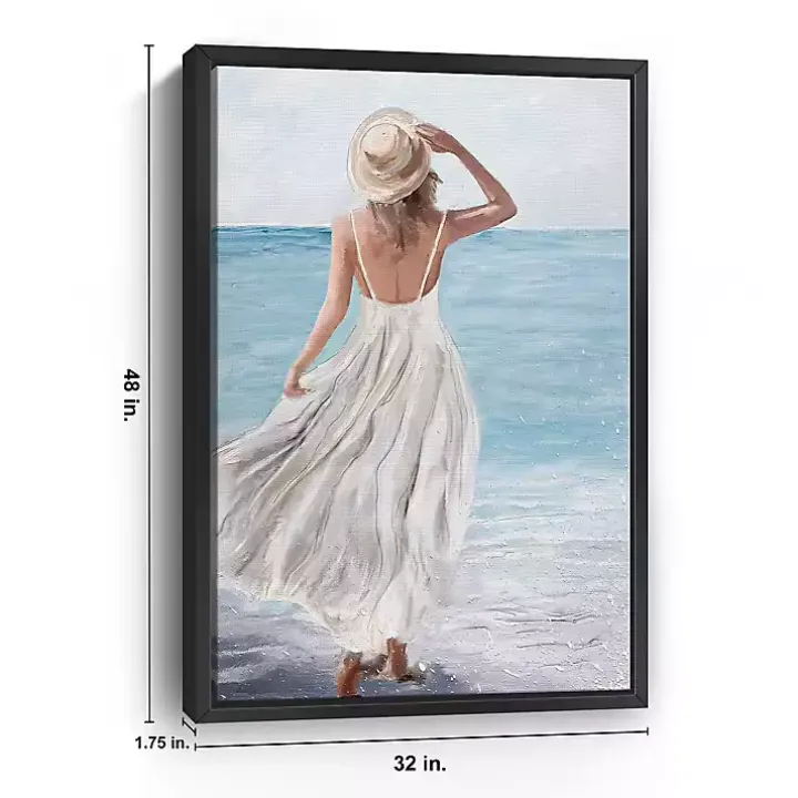 Bring sunny beach days home with this Coastal Woman in White Framed Canvas Art Print. It perfectly captures the breezy, laid-back feeling of being at the ocean!