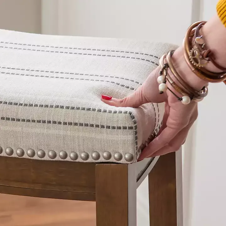 Hang out in style with our Dark Wood Bar Stool with Gray Striped Cushion! The brushed silver nailhead trim is an eye-catching detail you’ll love.