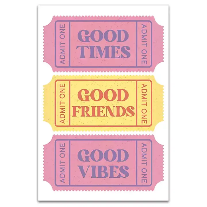 Let the good times roll with this Good Vibes Ticket Stub Canvas Art Print! This cute and colorful print will keep your space feeling positive and bright.
