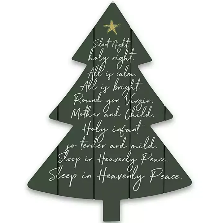 Spread peace and joy throughout your home with the Green Silent Night Christmas Tree Wall Plaque. The lyrics from the beautiful hymn will create a calm and holy feeling.