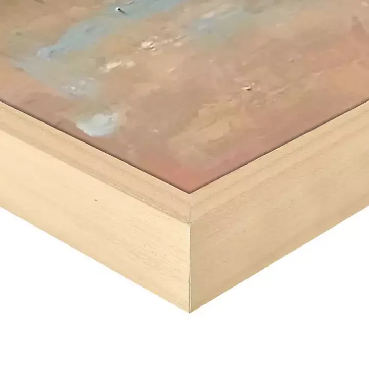 A serene lake reflects the golden hour peachy sky in this Heavenly Glow Framed Canvas Art Print. The distant forest and still waters capture the harmony and ethereal beauty of nature.