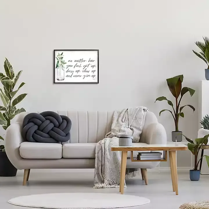 - Features the phrase “no matter how you feel, get up, get dressed, show up, and never give up” in black lettering