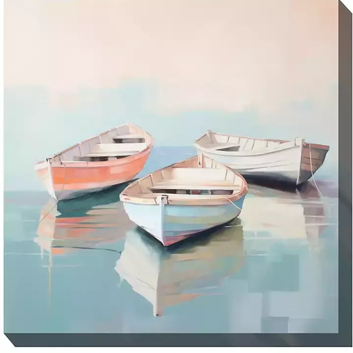 Our Pastel Boats Outdoor Canvas Art Print features three undisturbed canoes floating on still morning water. Gift this canvas to a friend who spends all their free time canoeing.