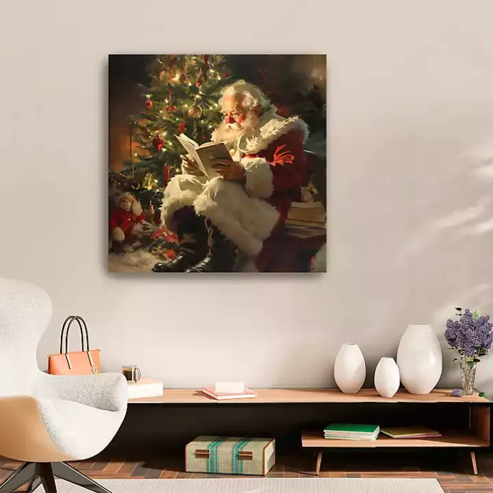 The Santa’s Stories Canvas Art Print features the man himself sitting by the Christmas tree bundled up with a book! Let this warm and cozy scene spread the holiday spirit throughout your home.