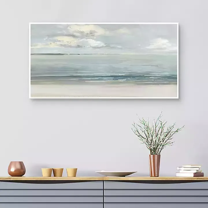 Drift away in the endless sea of the Serene Sound Framed Canvas Art Print. This majestic peace will add a sense of peace into any coastal themed room!