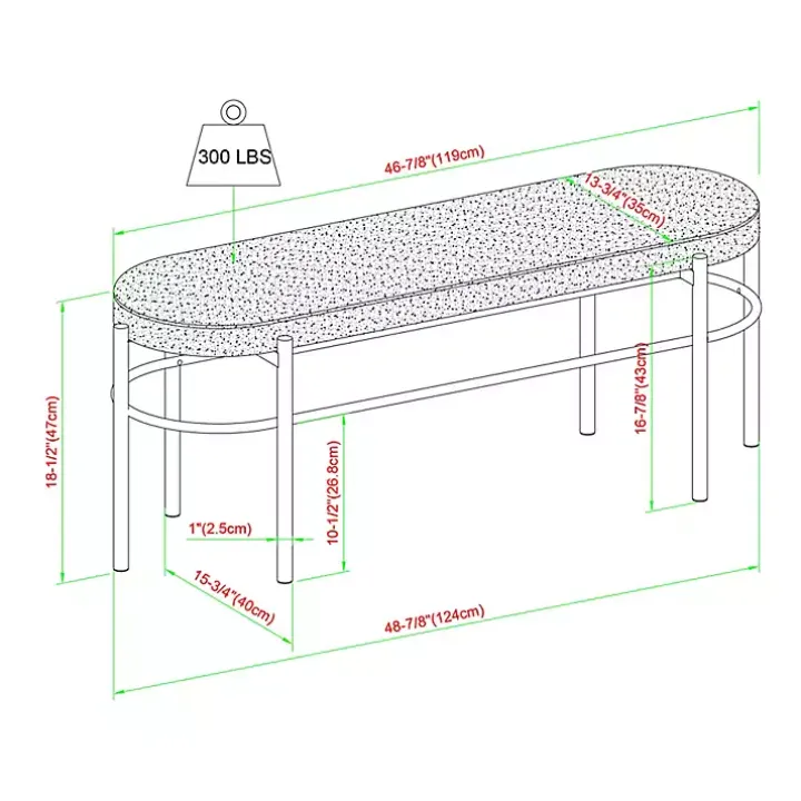 - Bench measures 48.9L x 15.75W x 18.5H in.