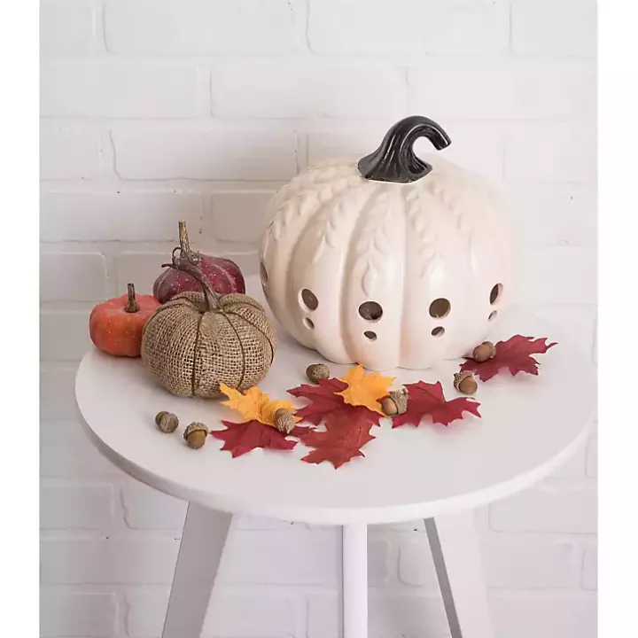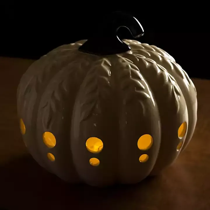 White Ceramic Leaf Pre-Lit Pumpkin Lantern