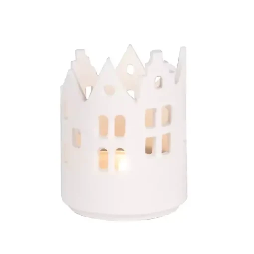 Give your table display a warm and cozy look with the White City Light Cityscape Votive Candle Holder. You’ll adore how any votive candle glows through the unique, architectural design.