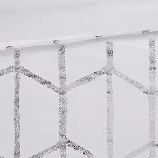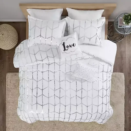Freshen up your bedroom with the enchanting style of this White Metallic 5-pc. Full/Queen Comforter Set. It flaunts a silver geometric print, while a matching sham and complementary pillows pull the ensemble together!