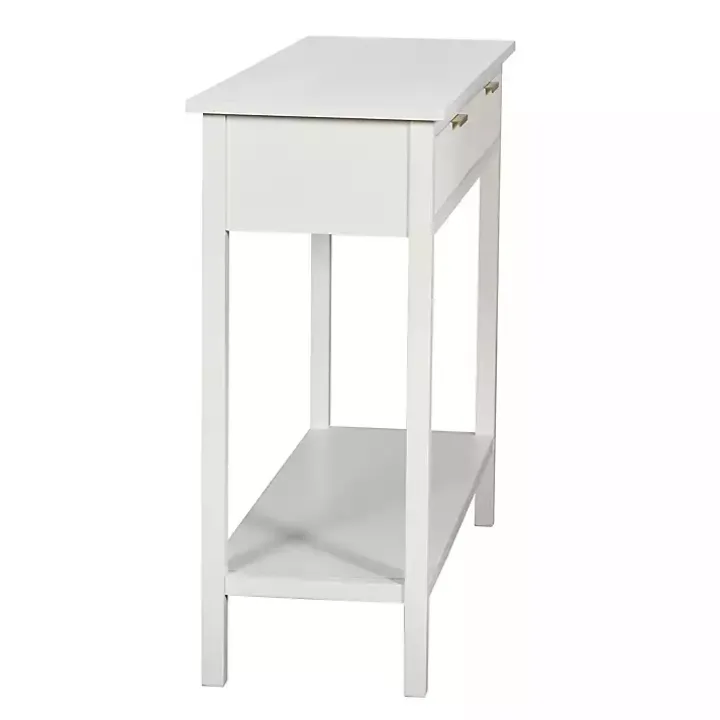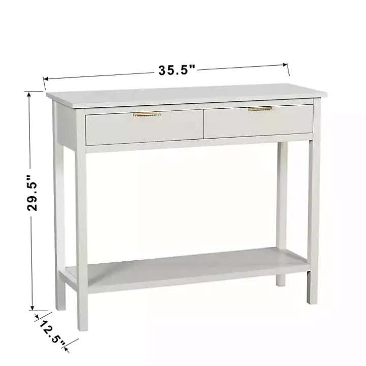 Refresh your space with a modern touch! This White Ribbed Wood 2-Drawer Colleen Console Table features a crisp white finish and chic gold handles for an elegant, elevated look. With two drawers and a lower shelf, this console table has what you need to stay organized in style!